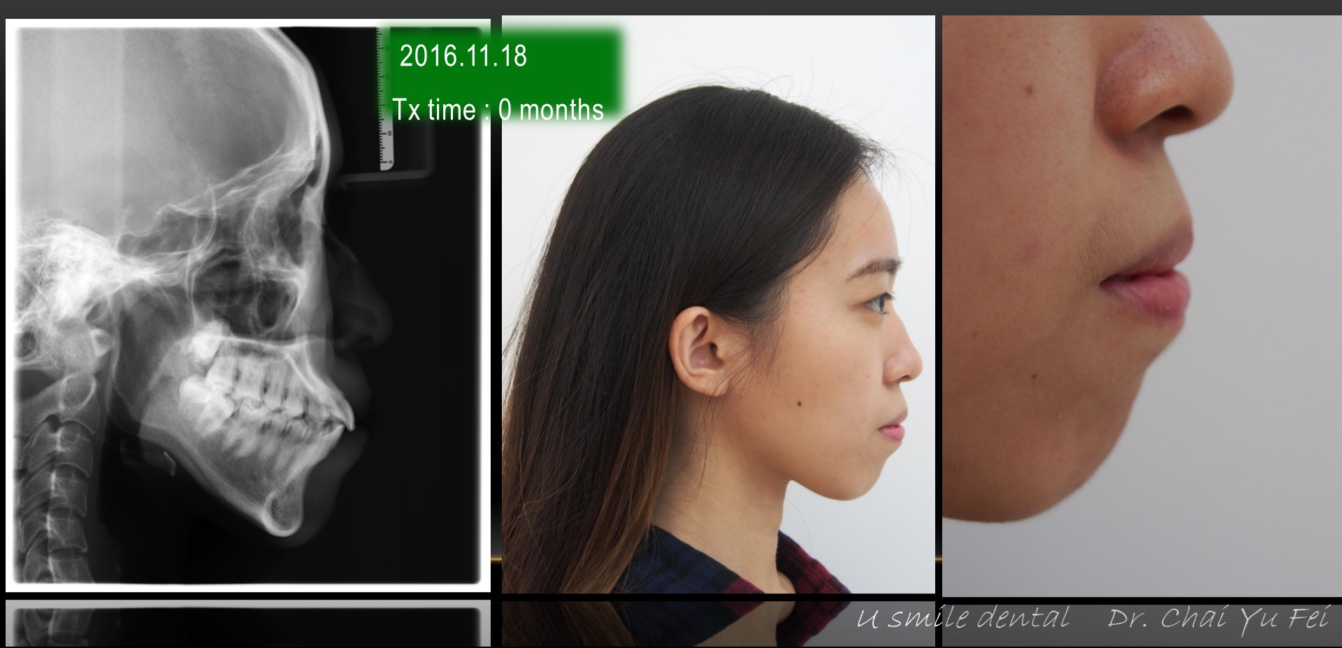 由側頭顱X光片來看,可以見到她上下顎牙齒都比較前突,造成她唇形以及側面輪廓比較不理想。