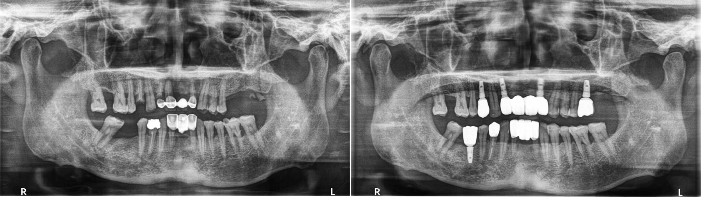 了解之後,重建之路由此展開,處理的順序先從建立新的後牙咬合開始,利用三顆植牙和一顆假牙讓病人有穩定的後牙咬合後就差不多完成了,最後回到前牙,兩顆植牙乘載四顆假牙和下排換掉不美觀的假牙後完成病人的笑容