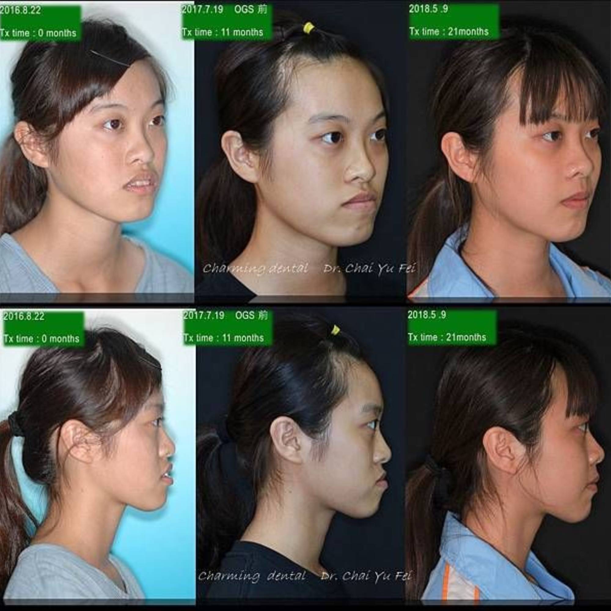 從患者的側面來看,上下唇都是不能夠自然地閉上嘴巴,經過幾個月的準備,已經達到手術前標準,接著術後調整到理想的外觀.