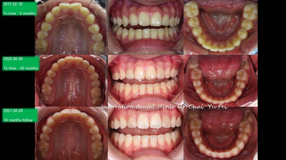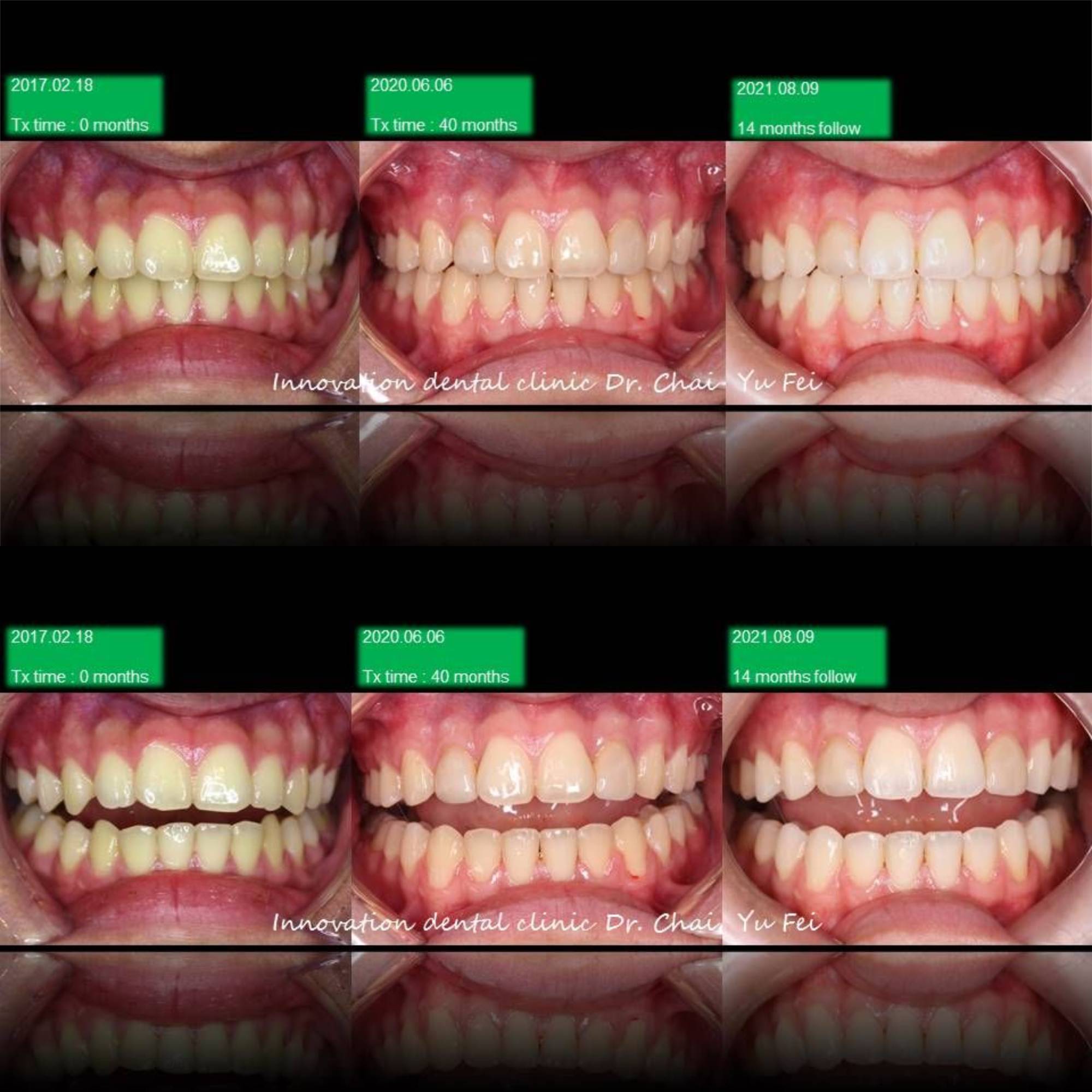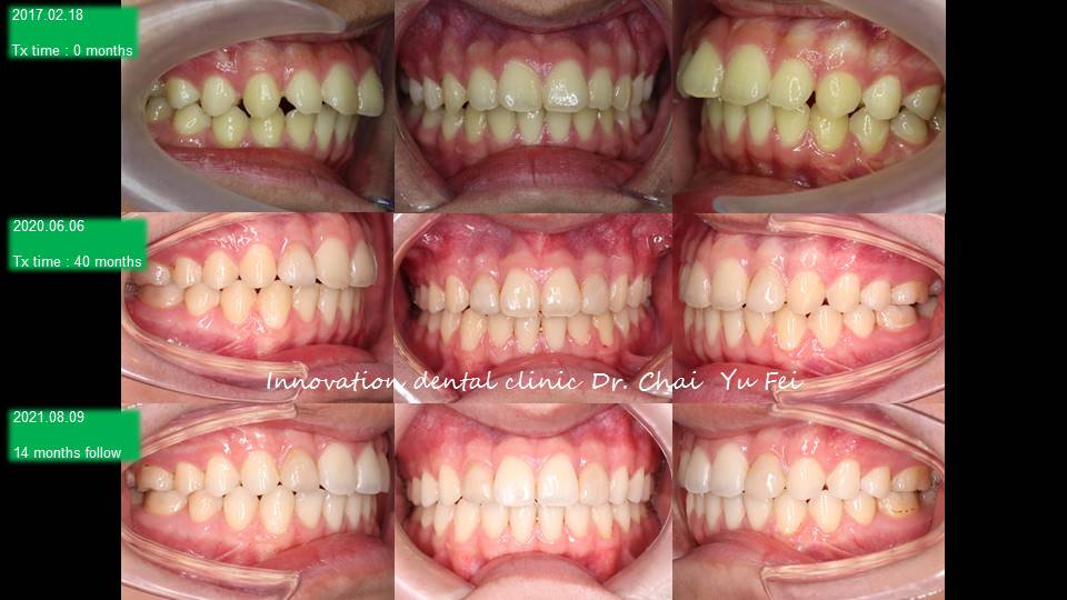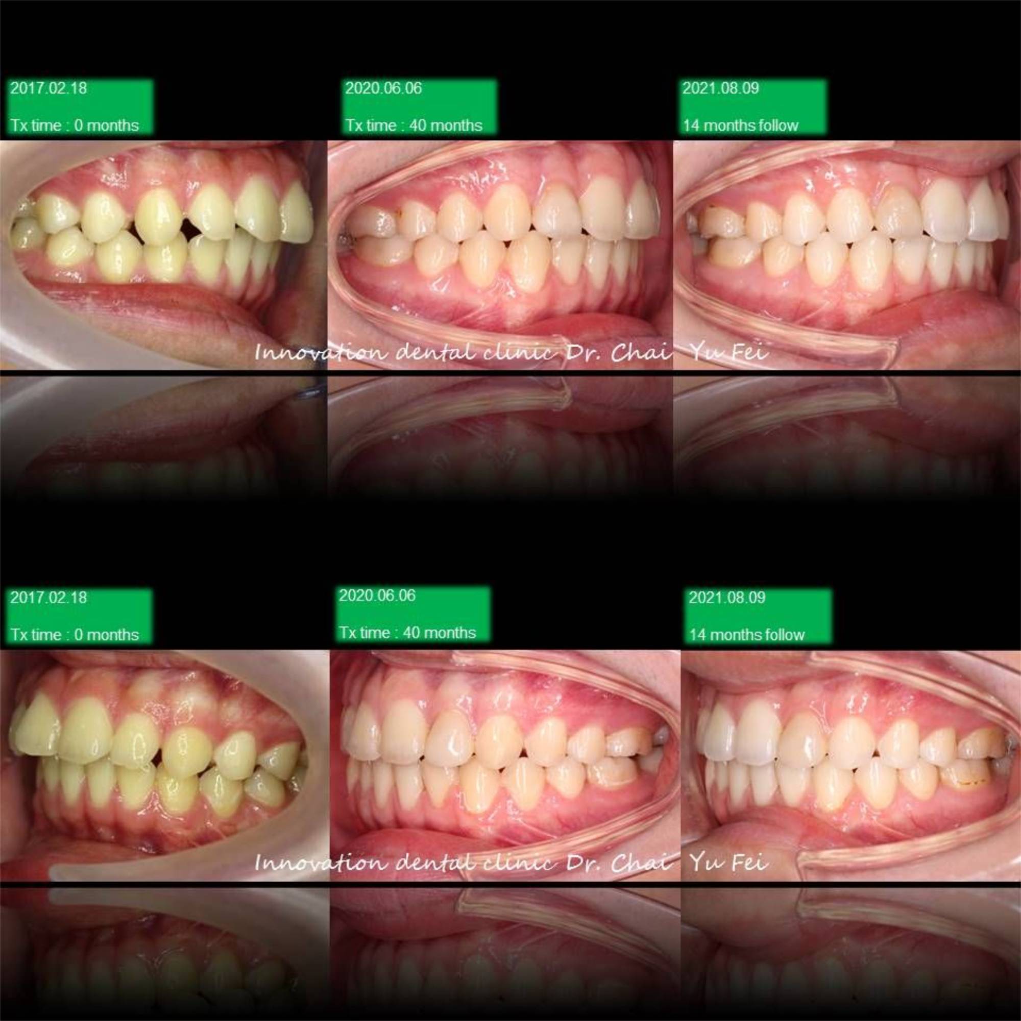 [ 治療方式 ] : 利用矯正 , 將前突的齒列內收,改善外觀,右側咬合高度喪失重建,植牙,恢復美觀功能