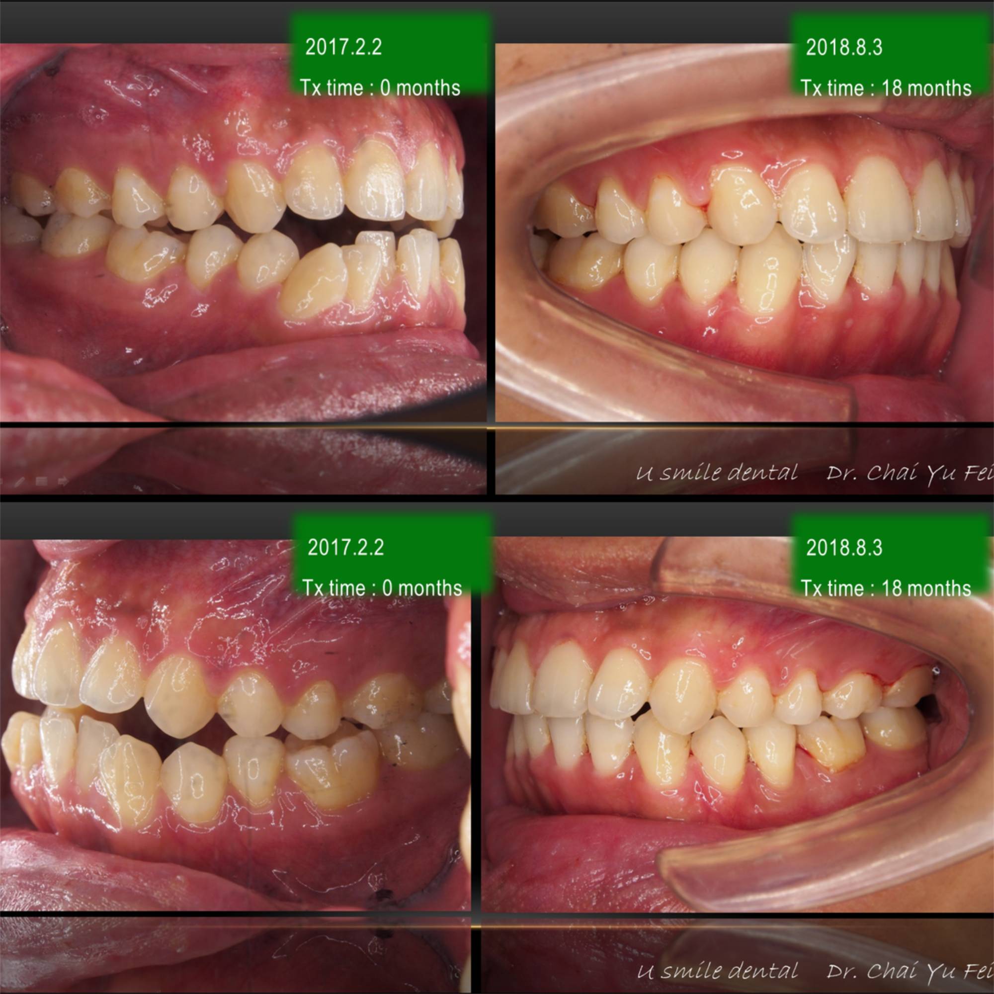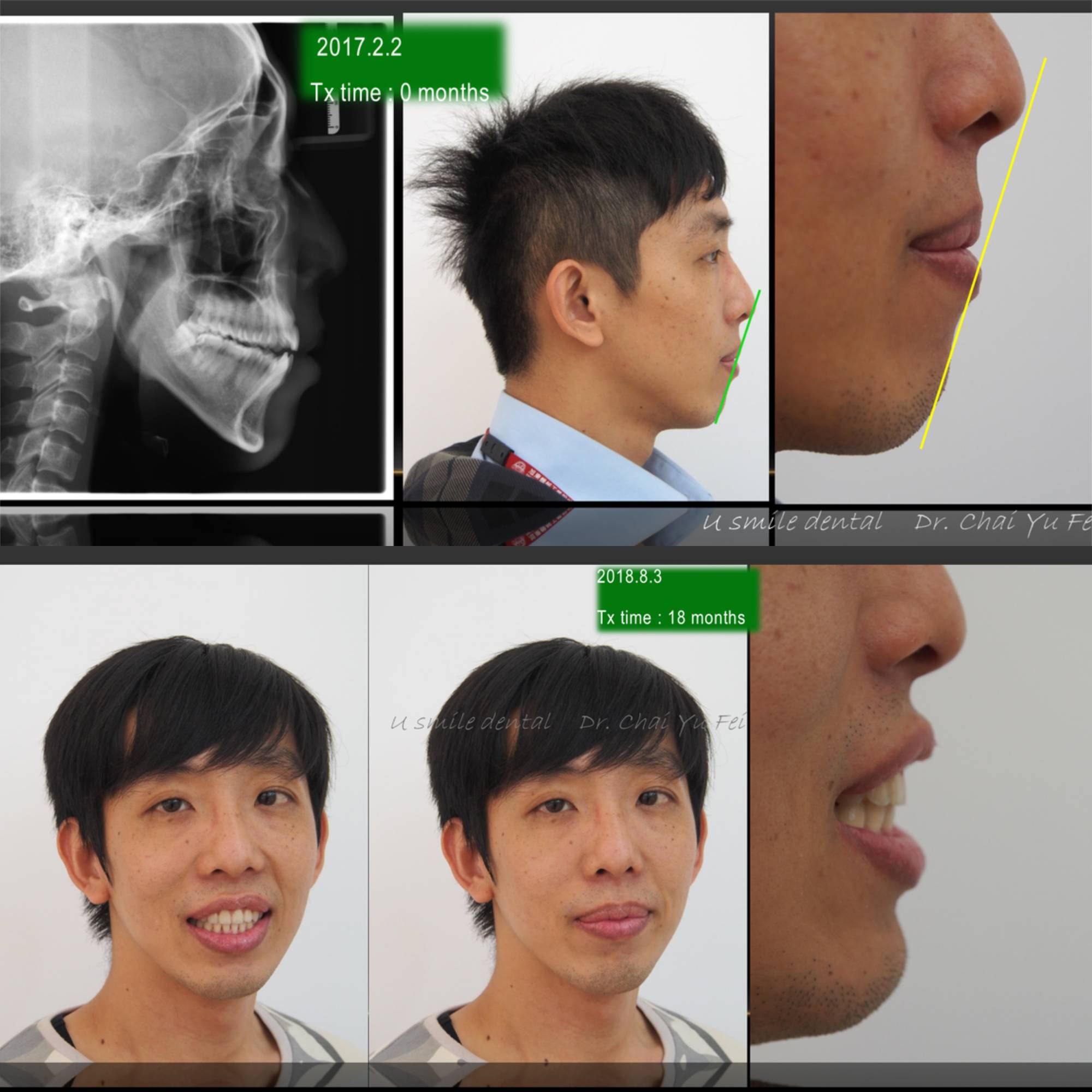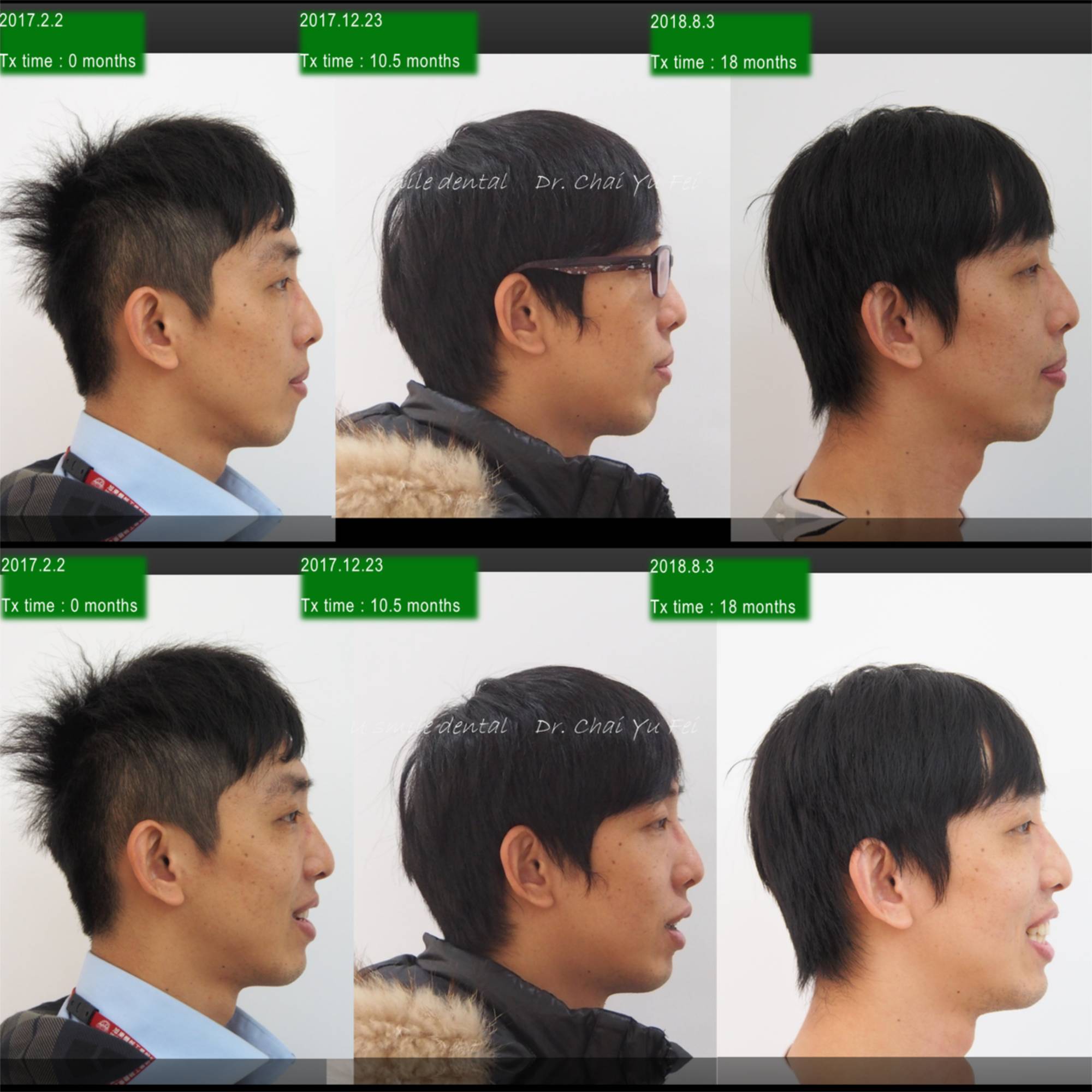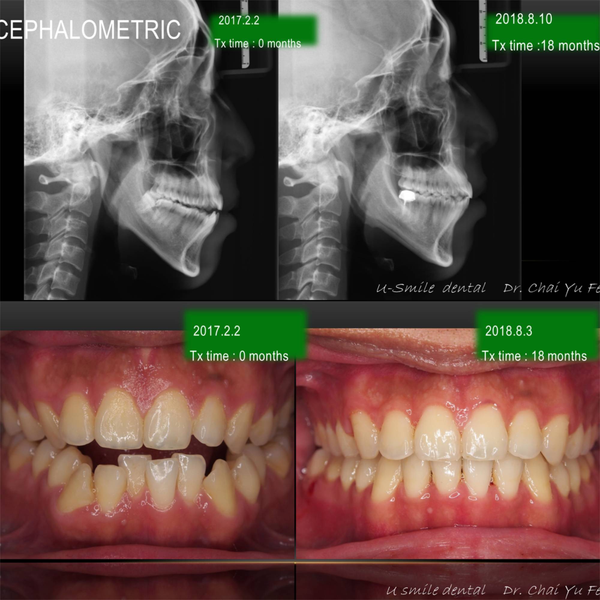 [ 治療方式 ] : 不拔牙矯正 ,利用迷你骨釘 , 將下顎齒列向後退,改善外觀。